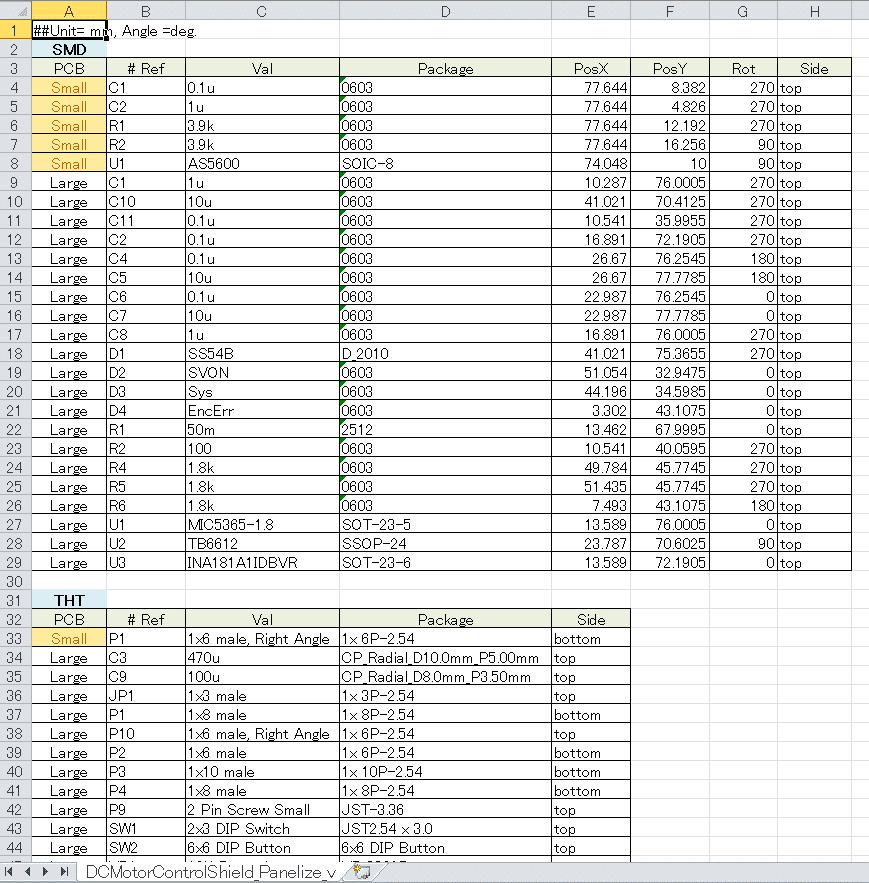 - 4_PartsMapping_DCMotorControlShield_v01.xlsx :部品の位置情報ファイル。表面実装部品は各部品の位置と方向とはんだ付け面、スルーホール部品ははんだ付け面を指定します。 KiCadの場合、Pcbnewの「ファイル」 → 「製造用各種ファイル出力」 → 「フットプリント位置情報ファイル」で表面実装部品の位置を出力できるので、それをElecrowのフォーマットに手動で修正しました。