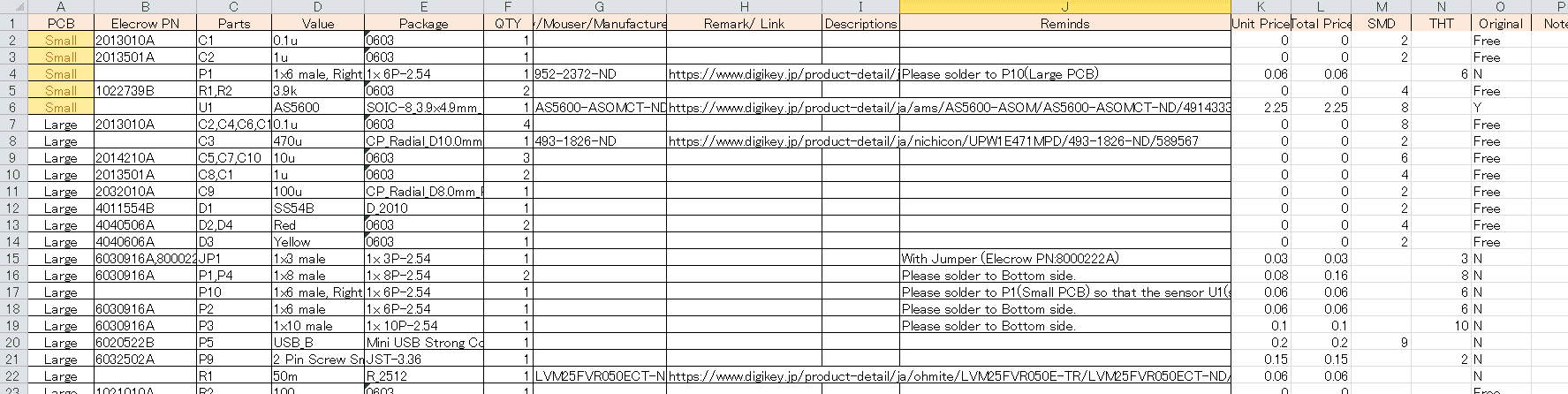 今回は2種類の基板を面付けしてもらっており、どちらの基板の部品かを識別するために"PCB"という項目を追加で記載しています。 KiCadの場合、Pcbnewの「ファイル」 → 「製造用各種ファイル出力」 → 「BOMファイル」でcsv形式でBOMを出力できるので、それをElecrowのフォーマットに手動で修正しました。