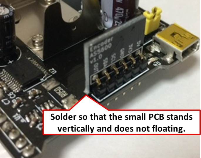 Reminds.jpg :注意事項。今回は2種類の基板を面付けしており、面付基板を切り離した後にエンコーダ基板をメイン基板に垂直に立つようはんだ付けしてほしかったので、以下のように図で指示しました。 ちなみに、下側の注意事項で「垂直かつ基板が浮かないように」と指示しているのは、磁気式エンコーダICの中心にあるホール素子とモータ軸に付ける磁石の軸中心と一致させるためです。