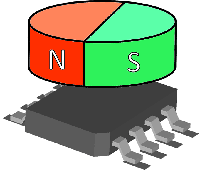 AS5600/AS5601は4つのホール素子を円状に並べた磁気式エンコーダであり、以下の図に示すように径方向に着磁した円柱型の磁石を回転させることでその磁力のバランスをホール素子で検出・演算し角度を求めます。