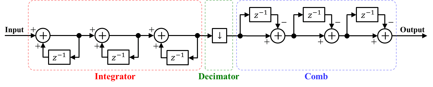 CICフィルタは積分器(Integrator)と微分器(Comb filter)を組み合わせたSINCフィルタをカスケード接続したものです。実装時は演算負荷を低減するために以下の図のように積分器と微分器をまとめ、その間にデシメーションフィルタを入れた構成にします。(図は3次のCICフィルタです)