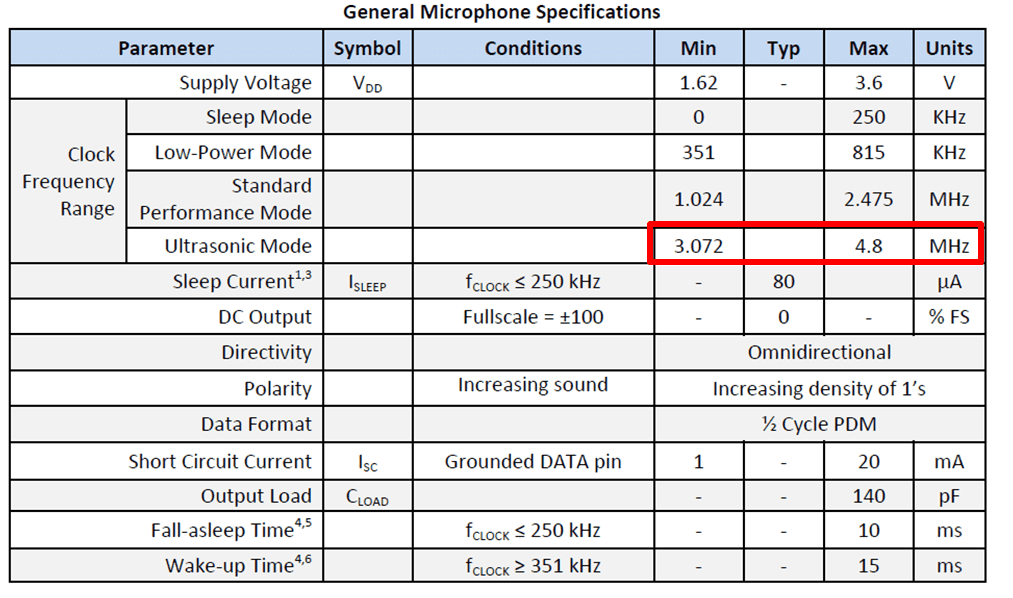 デジタルマイクのクロック周波数をデータシートから確認します。