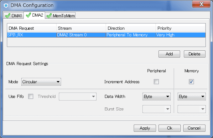 また、SPIをポーリング受信するとSPI受信関数 HAL_SPI_Receive 自体の処理時間のためクロック周期に誤差が生じるため、SPI受信DMAも設定しておきます。