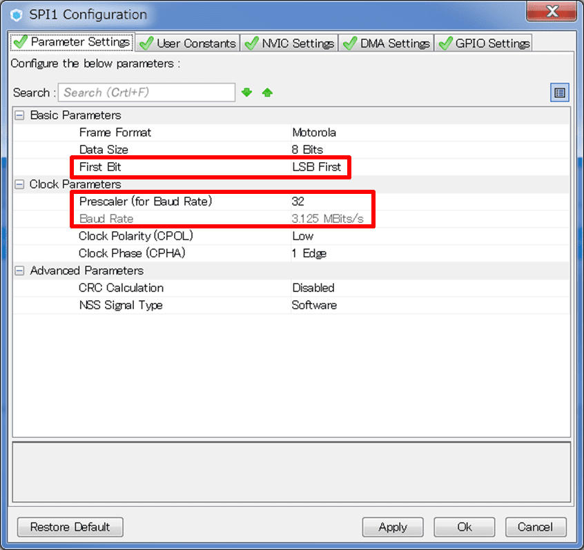 SPI設定では、First BitをLSB Firstに、Prescalerはボーレートがデジタルマイクのクロック周波数に合うよう設定します。