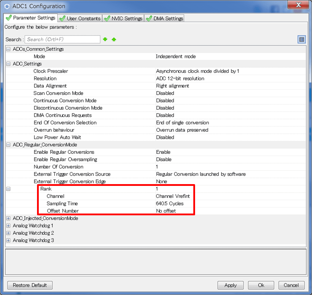 次にADCの設定を行います。レギュラ変換のチャンネルを"Channel Vrefint"とし、ノイズの影響を低減するためにサンプリングタイムを長めにとります。