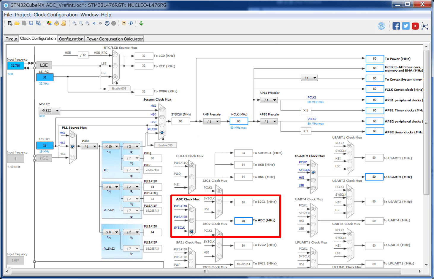 次にクロックの設定をします。今回はADCのクロック源をSYSCLK:80MHzと設定しました。