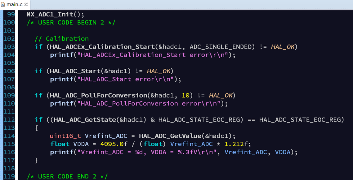 114行目で \( V_{\mathrm{REFINT}} \) の変換結果を取得しています。
