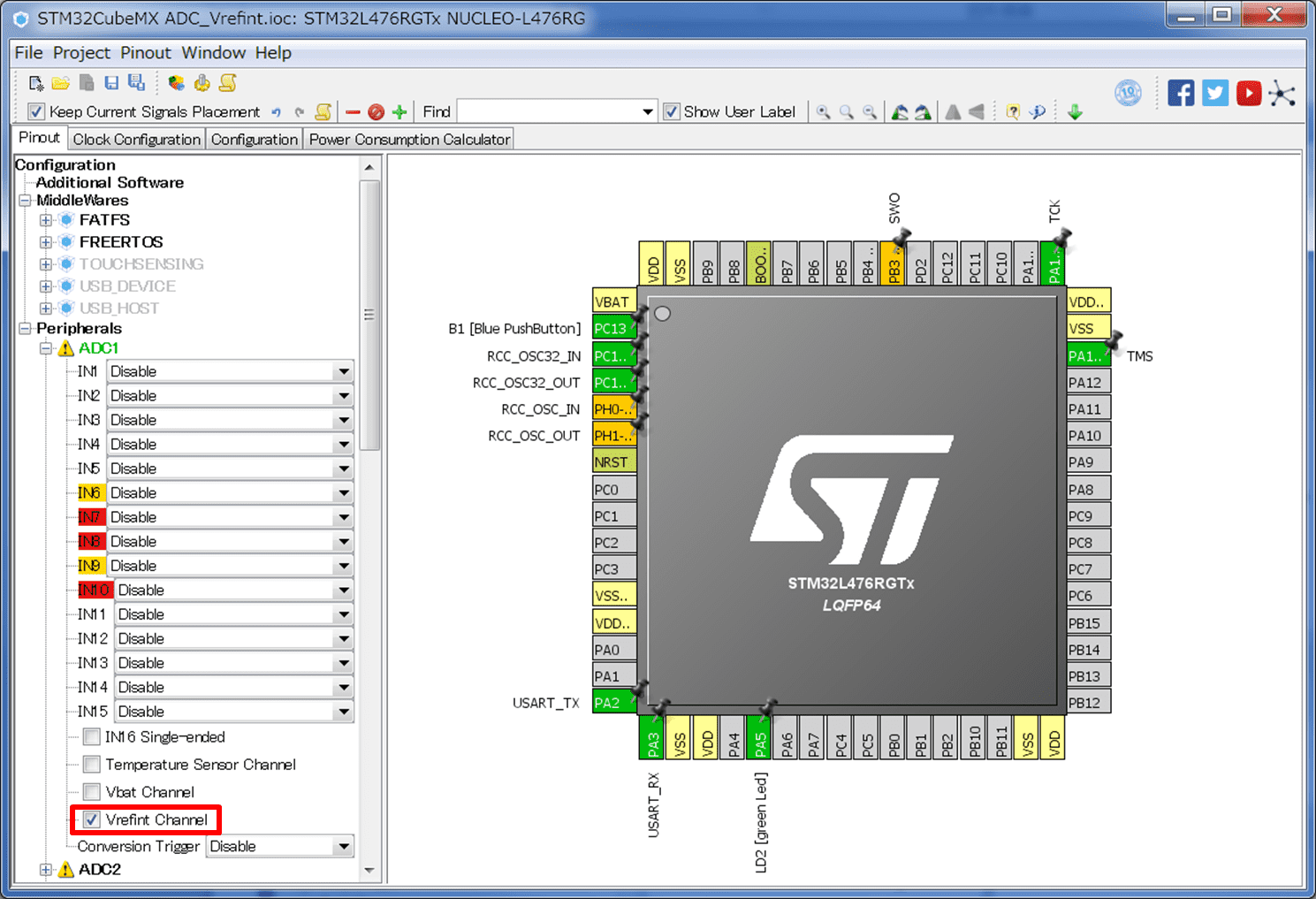 本記事ではNUCLEO-L476RGを使用して \( V_{\mathrm{REFINT}} \) を計測し、そこから電源電圧を計測する方法を紹介します。