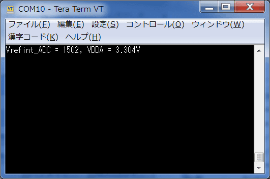 なお、サンプルコードの115行目では周辺温度25℃、 \( V_{\mathrm{REFINT}} =1.212\mathrm{V}\) と仮定して\( V_{\mathrm{DDA}} \)を求めています。