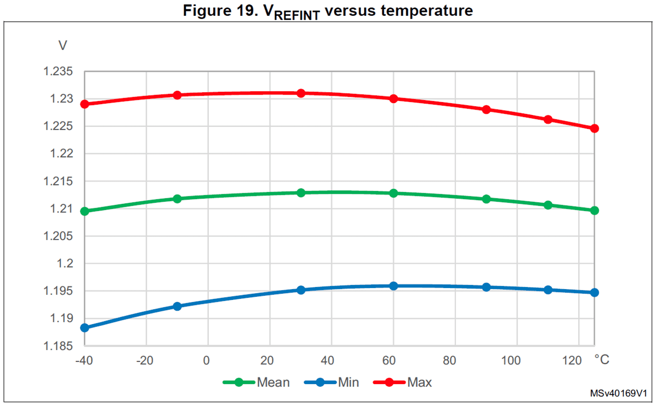 \( V_{\mathrm{REFINT}} \) はマイコン自体の個体差と周辺温度によって変化し、その関係性はSTM32L476RGのデータシートのFigure 19に示されています。